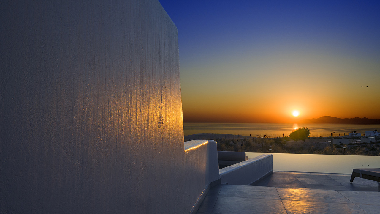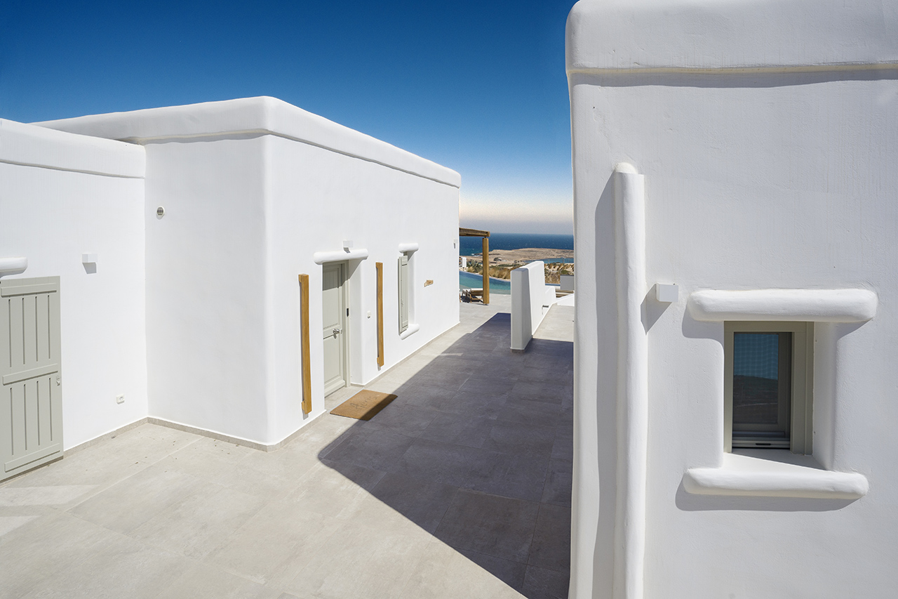 Aeris suites Chora consists of two suites with private pools and an apartment with a yard. Suites are built on two levels.on the upper floor , the master bedroom can be found whose balcony hosts the private pool , while on the lower floor there is a closet, the bathroom, the kitchen and a sofa bed.