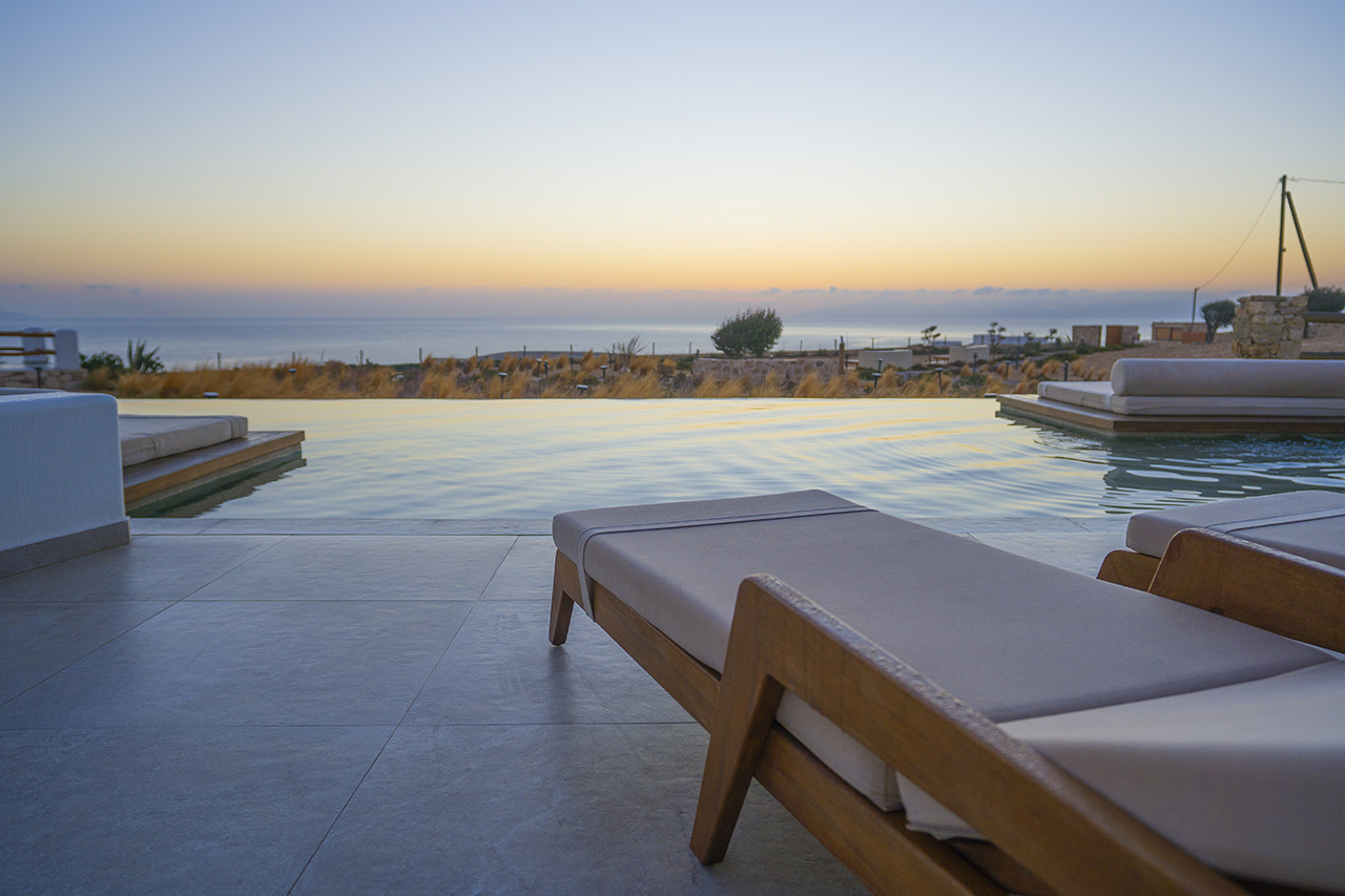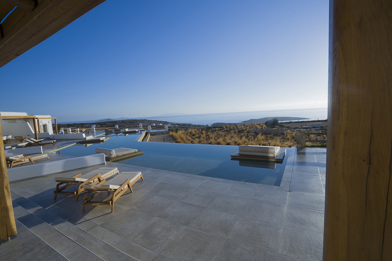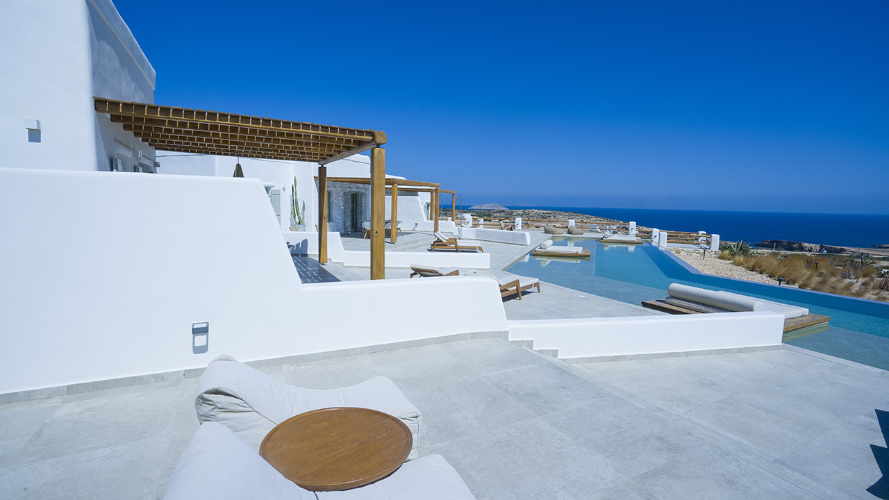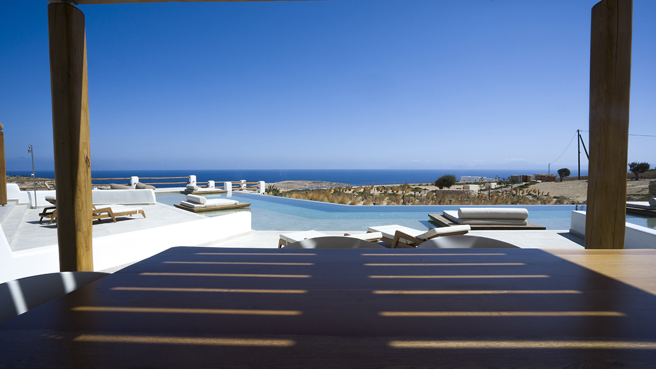 Aeris suites Pori is a complex of villas located 1,5 km from the center of chora Just above pori beach providing amazing view of the xylompatis caves and the aegean Sea. Built on an area of seven acres, there are 6 villas in total.
