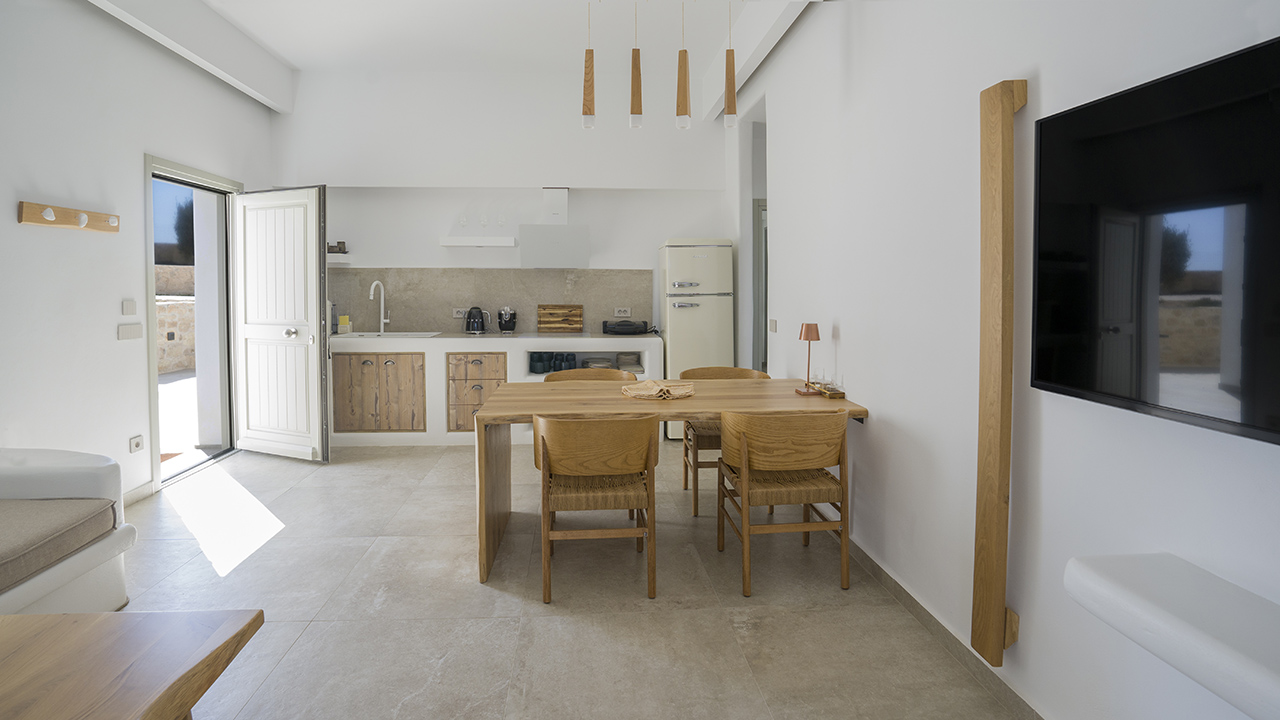 Aeris suites chora consists of two suites with private pools and an apartment with a yard Suites are built on two levels.on the upper floor , the master bedroom can be found whose balcony hosts the private pool , while on the lower floor there is a closet , the bathroom , the kitchen and a sofa bed. Across from the Saint George Church, the apartment accommodates two guests, offering ample outdoor space for dining or relaxation.